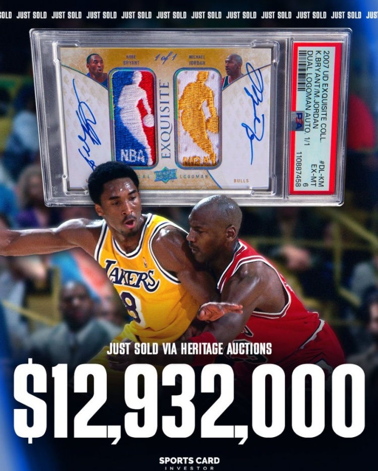 8月24日訊 據(jù)The Athletic報(bào)道,一張獨(dú)一無(wú)二的2007-08賽季Upper Deck Exquisite Collection系列喬丹與科比雙LogoMan(來(lái)自他們各自比賽穿過(guò)的球衣上的NBA標(biāo)志補(bǔ)?。┖灻a(bǔ)丁卡,在(美國(guó)當(dāng)?shù)貢r(shí)間)周日凌晨通過(guò)Heritage Auctions拍賣行以1293.2萬(wàn)美元的價(jià)格售出。
