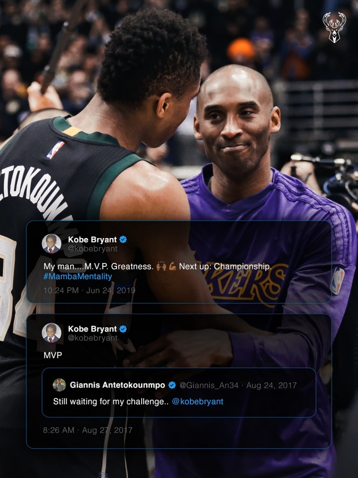 2017年,科比在推特上給一眾NBA球星給予自己的挑戰(zhàn),字母哥也發(fā)推稱“正在等待我的挑戰(zhàn)內(nèi)容”,科比回復(fù):“MVP!”