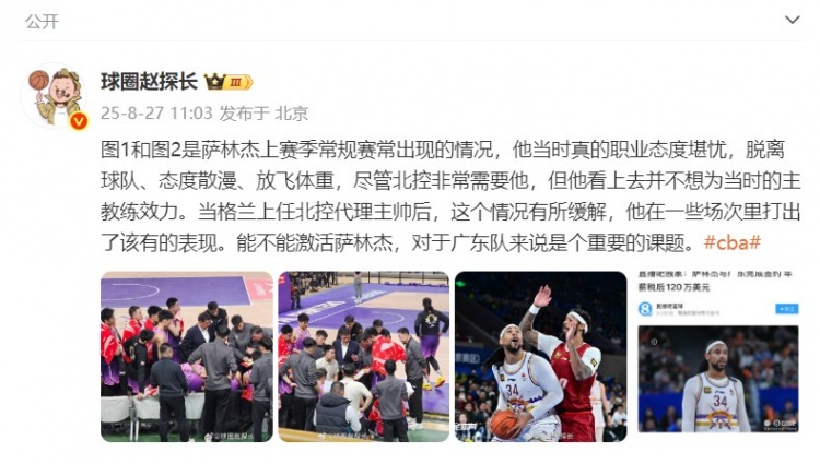 8月27日訊 今天,媒體人@球圈趙探長 在社媒上談到了薩林杰加盟廣東男籃一事。
