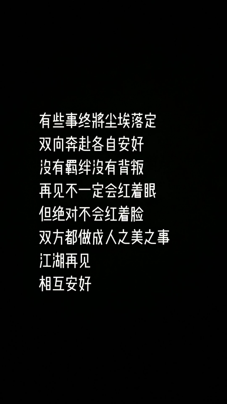 圖片中的內(nèi)容為:有些人終將塵埃落定,雙向奔赴各自安好,沒(méi)有羈絆沒(méi)有背叛,再見(jiàn)不一定會(huì)紅著眼,但絕對(duì)不會(huì)紅著臉,雙方都做成人之美之事,江湖再見(jiàn),各自安好。