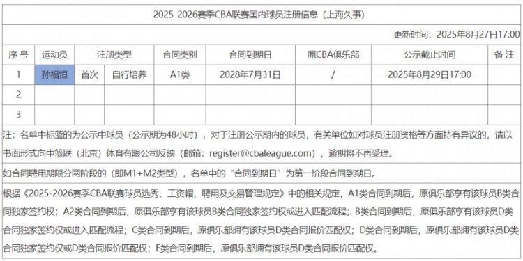8月27日訊 CBA官網(wǎng)今天更新了國內(nèi)球員注冊信息,其中,上海男籃注冊了1名球員。