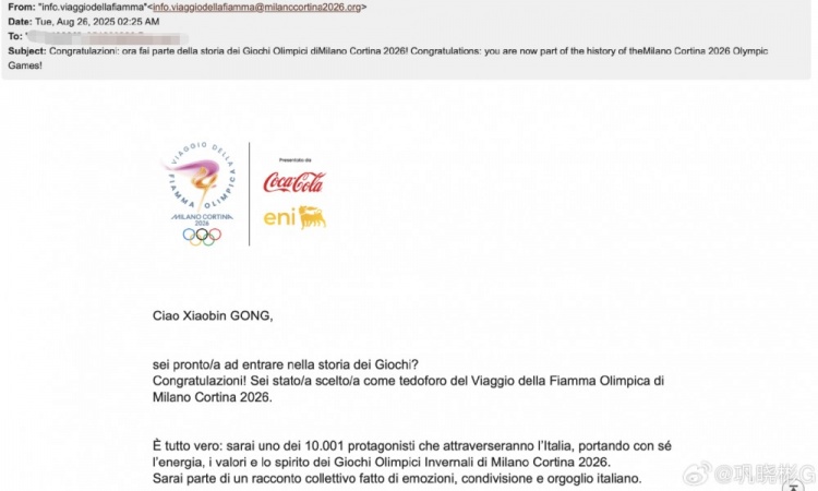 8月27日訊 中國籃球名宿鞏曉彬更新社媒,曬出米蘭冬奧組委發(fā)來的火炬手邀請信。
