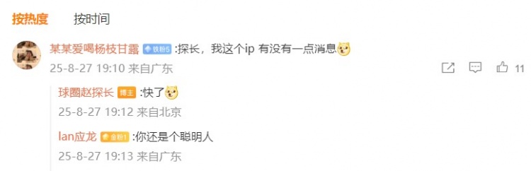對一名IP歸屬地為廣東的網(wǎng)友的詢問,@球圈趙探長 回復(fù):“快了。”