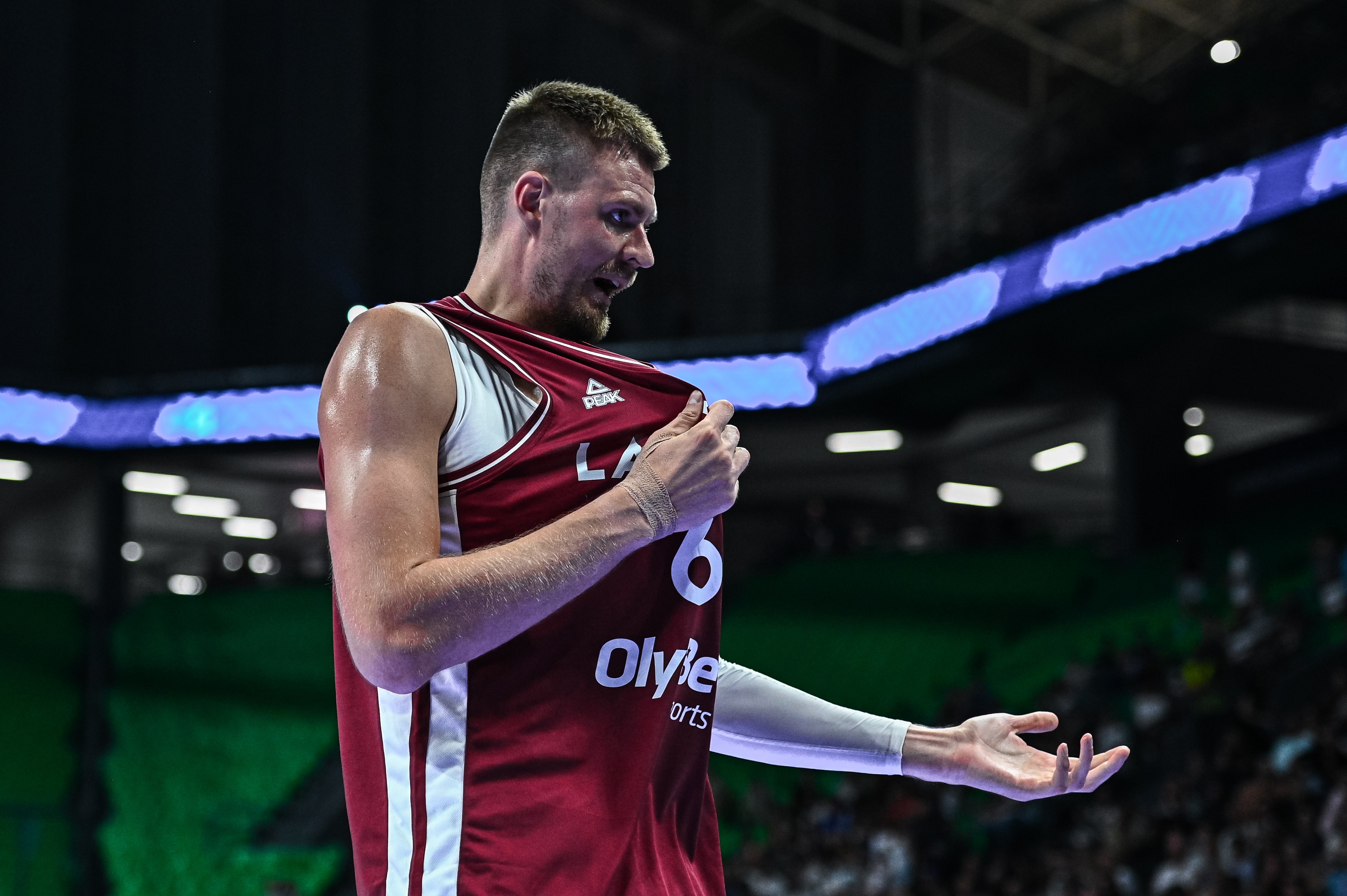 拉脫維亞內(nèi)線波爾津吉斯雖然上半場打得十分積極,但投籃手感并不理想,而且還遭對方后衛(wèi)哈澤爾隔扣。
