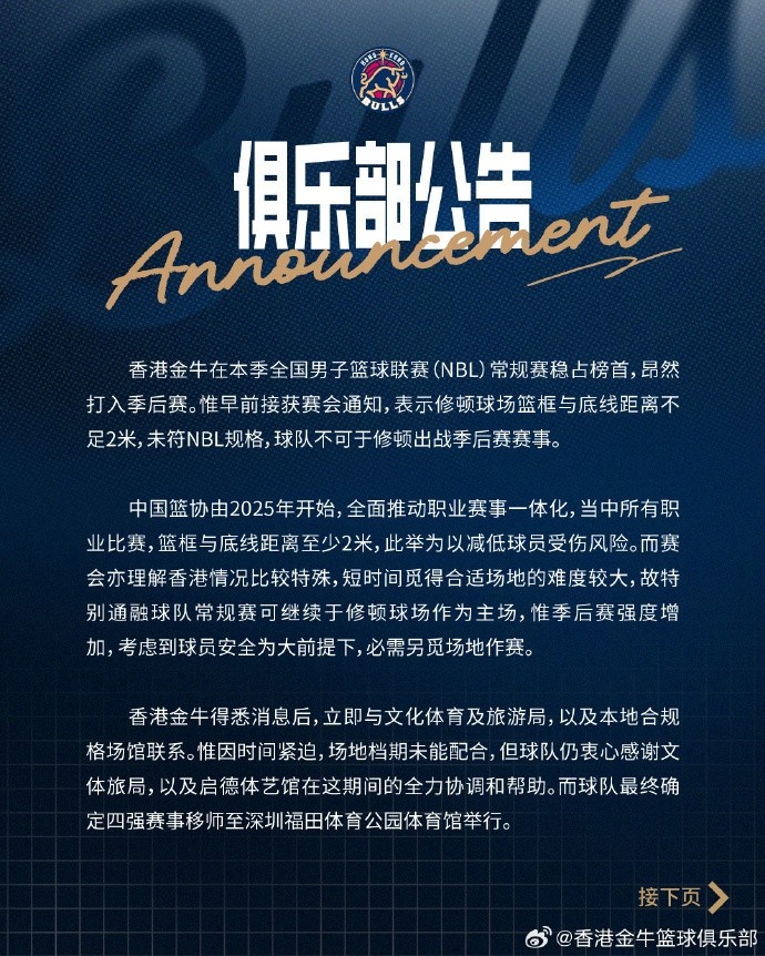 香港金牛在本季全國男子籃球聯(lián)賽(NBL) 常規(guī)賽穩(wěn)占榜首,昂然打入季后賽。惟早前接獲賽會通知,表示修頓球場籃框與底線距離不足2米,未符NBL規(guī)格,球隊(duì)不可于修頓出戰(zhàn)季后賽賽事。