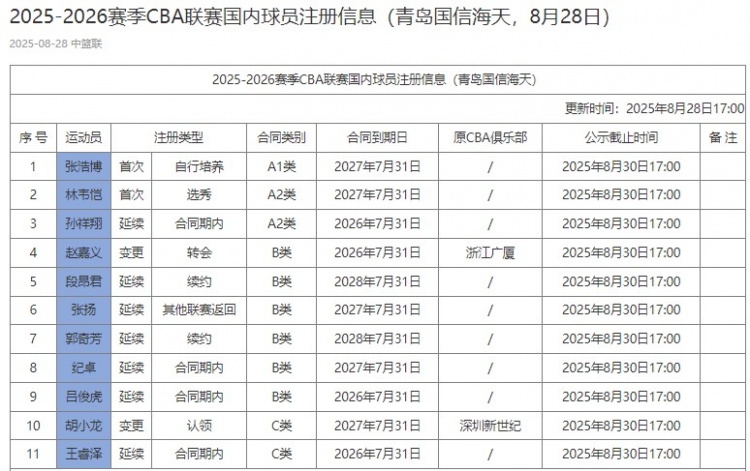 8月28日訊 今天,青島男籃公布了新賽季的國內(nèi)球員注冊信息。其中: