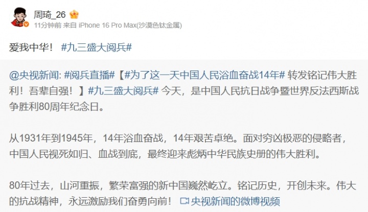 周琦觀看閱兵并轉(zhuǎn)發(fā)微博:愛我中華!