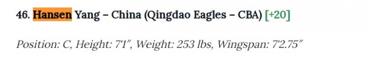 本次選秀大會魔術(shù)擁有46號簽。楊瀚森在該網(wǎng)站的排名比最早上升了20位。
