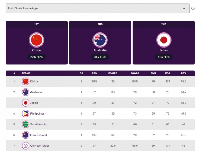 據(jù)亞洲杯官網(wǎng)統(tǒng)計,中國男籃2場過后的投籃命中率高達52.6%,暫列第1位!澳大利亞和日本同為51.4%,并列第二。