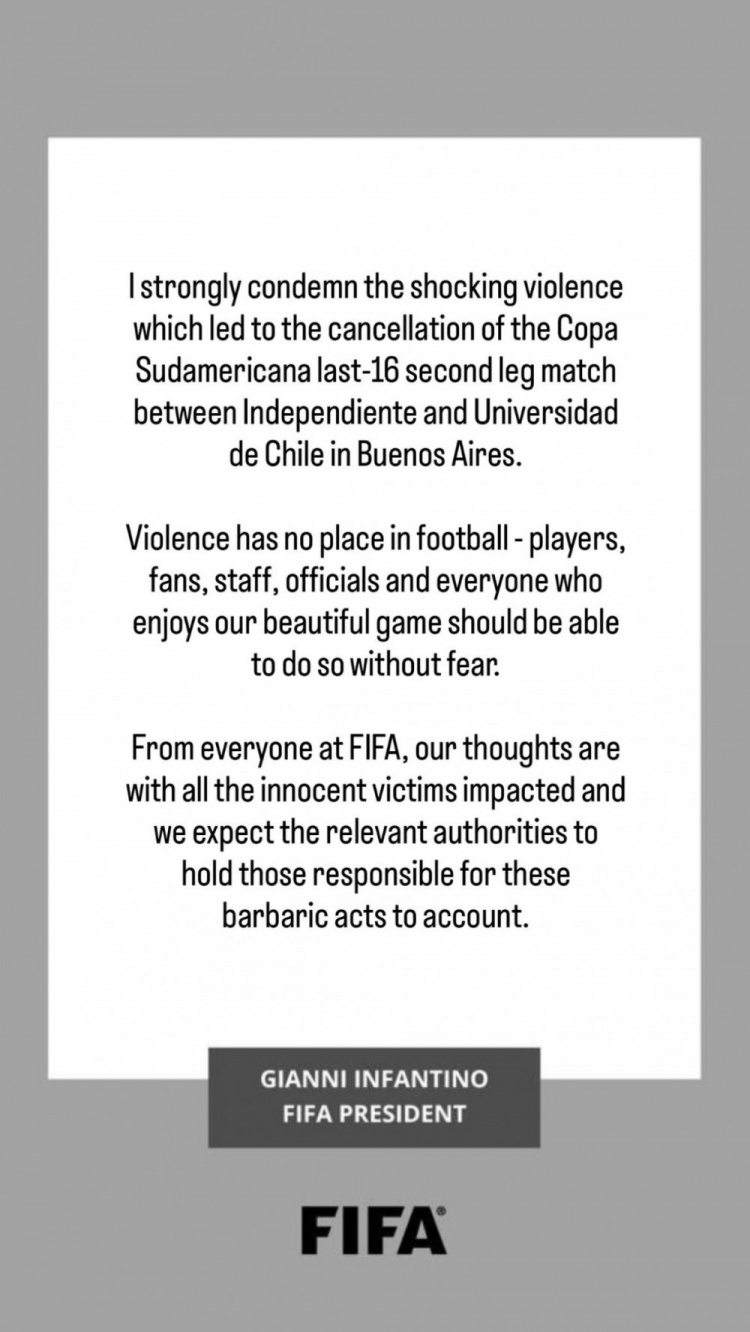 國際足聯(lián)主席因凡蒂諾社媒譴責(zé)暴力行為,他寫道:“我強烈譴責(zé)導(dǎo)致阿根廷獨立隊與智利大學(xué)隊在南美杯16強次回合比賽取消的令人震驚的暴力事件。