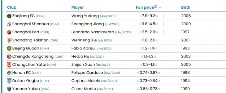 09月05日訊 著名足球數據統(tǒng)計機構cies,計算出了各國聯賽的球員轉會價值榜,在中超球員中,王鈺棟獨占鰲頭。
