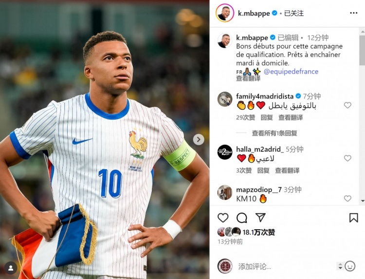 姆巴佩社媒曬出比賽照片,配文:“世預賽的良好開局,準備好周二在主場再接再厲?!?/p>