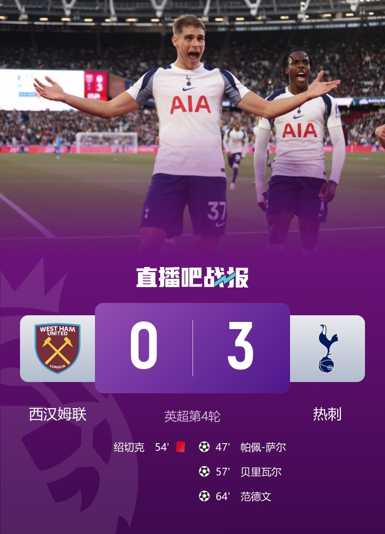 9月14日訊 數(shù)據(jù)顯示,熱刺隊(duì)史首次在英超客場(chǎng)贏西漢姆聯(lián)3球及以上。