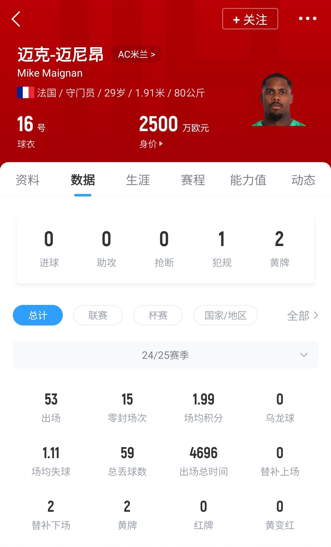 邁尼昂現(xiàn)年29歲,與AC米蘭的合同僅剩最后一年,德轉(zhuǎn)身價(jià)2500萬(wàn)歐。本賽季邁尼昂共為米蘭出戰(zhàn)53場(chǎng)比賽,完成15次零封。