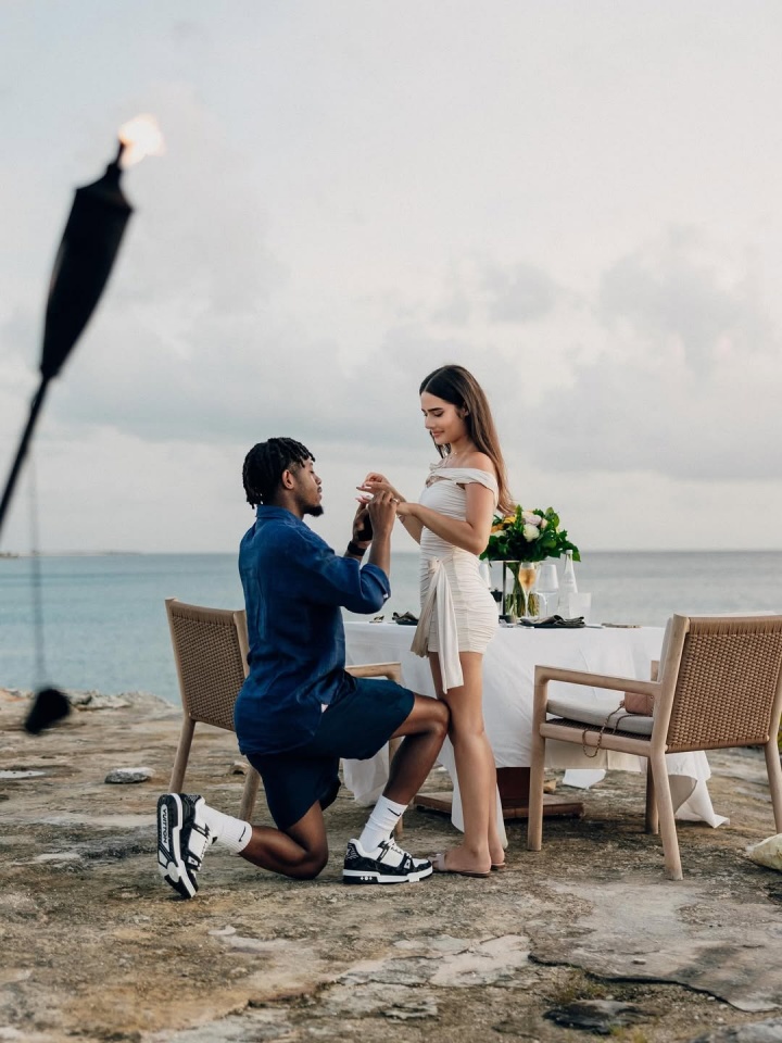 姆班古拉為女友戴上了一枚上面有水滴形狀的鉆戒。