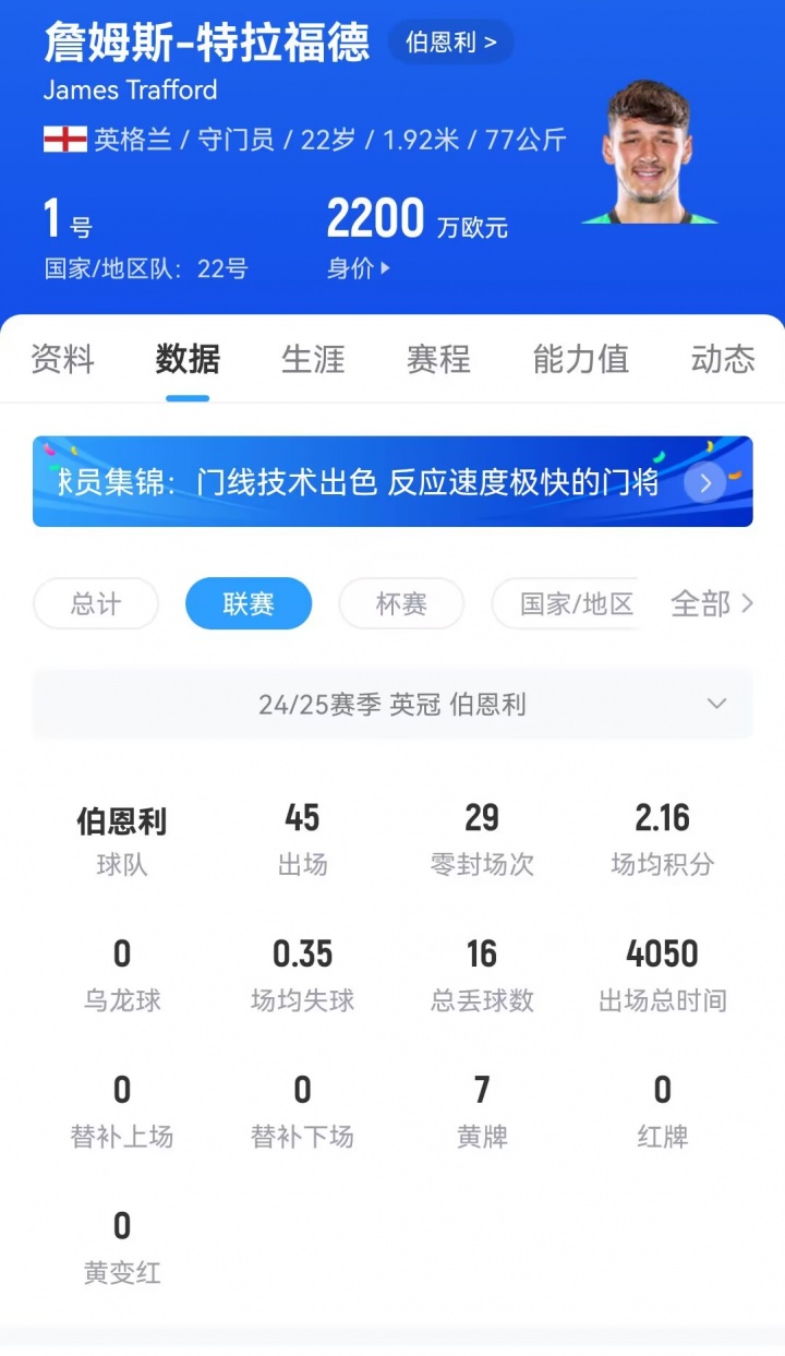 22歲的特拉福德上賽季為伯恩利在英冠出場(chǎng)45次,貢獻(xiàn)29場(chǎng)零封。球員目前的身價(jià)為2200萬(wàn)歐元,有消息稱曼城有意將其回購(gòu)。