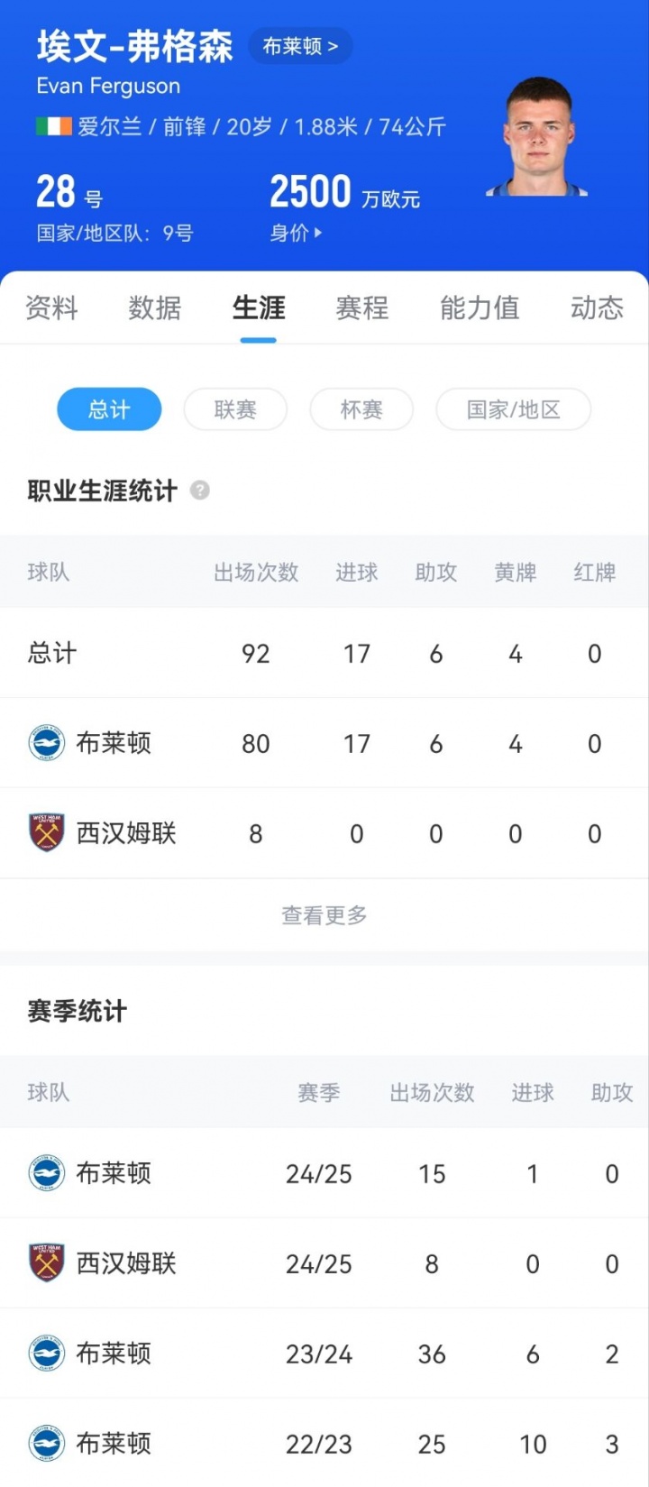 20歲的埃文-弗格森在兩年前也曾是萬(wàn)眾矚目的超新星,2022/23賽季中期,弗格森正式升入布萊頓一線隊(duì),當(dāng)賽季他在一線隊(duì)出場(chǎng)25次,貢獻(xiàn)10球3助攻。