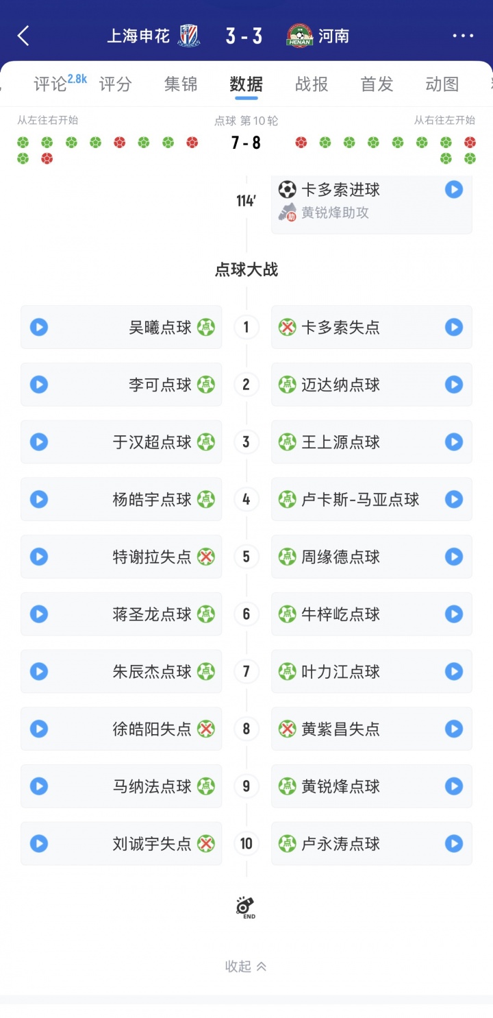足協(xié)杯河南淘汰申花,點(diǎn)球大戰(zhàn)10輪決勝!河南門(mén)將徐嘉敏三撲點(diǎn),申花門(mén)將薛慶浩兩次撲點(diǎn)。以下是點(diǎn)球全程回放: