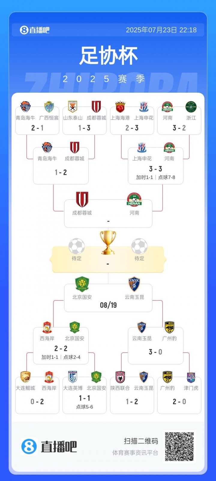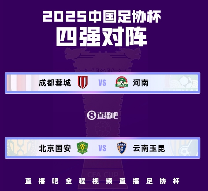 昨天的兩場1/4決賽,北京國安點球大戰(zhàn)戰(zhàn)勝青島西海岸,云南玉昆3-0擊敗廣東廣州豹,國安將與玉昆相遇。