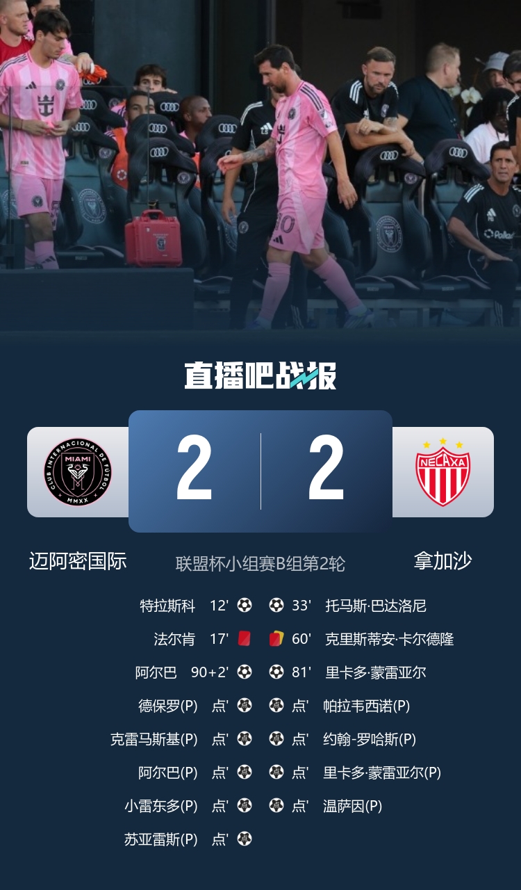 8月3日訊 北京時(shí)間8月3日07:00,聯(lián)盟杯小組賽B組第2輪邁阿密國(guó)際迎戰(zhàn)拿加沙的比賽在大通體育場(chǎng)進(jìn)行,上半場(chǎng)梅西第8分鐘傷退,德保羅助攻特拉斯科兜射首開(kāi)記錄,法爾肯直紅被罰下,巴達(dá)洛尼抽射扳平比分,半場(chǎng)結(jié)束,十人邁阿密國(guó)際1-1拿加沙。下半場(chǎng)羅哈斯遠(yuǎn)射中楣,卡爾德隆兩黃一紅被罰下,蒙雷亞爾推射反超比分,德保羅助攻阿爾巴頭球絕平,常規(guī)時(shí)間結(jié)束,十人邁阿密2-2十人拿加沙,點(diǎn)球大戰(zhàn)諾沃撲點(diǎn),最終邁阿密點(diǎn)球戰(zhàn)7比6戰(zhàn)勝拿加沙取得兩連勝。