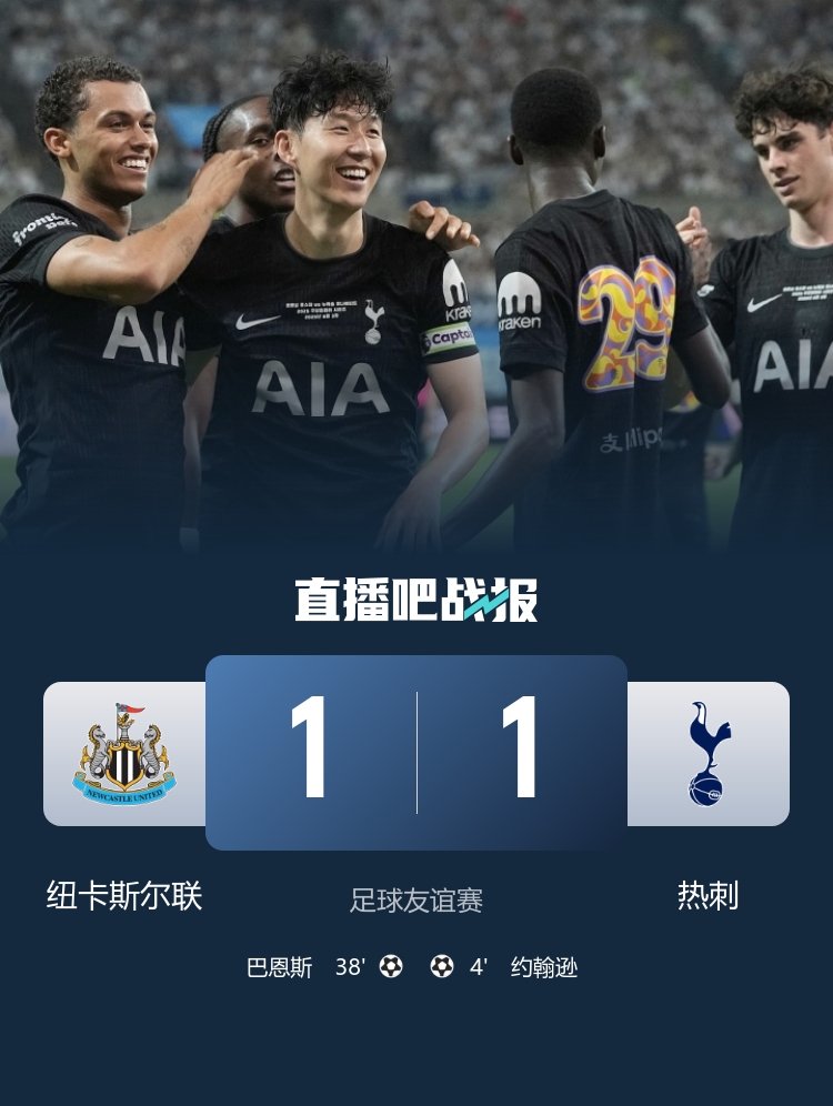上半場(chǎng)補(bǔ)時(shí)3分鐘,熱刺1-1紐卡。