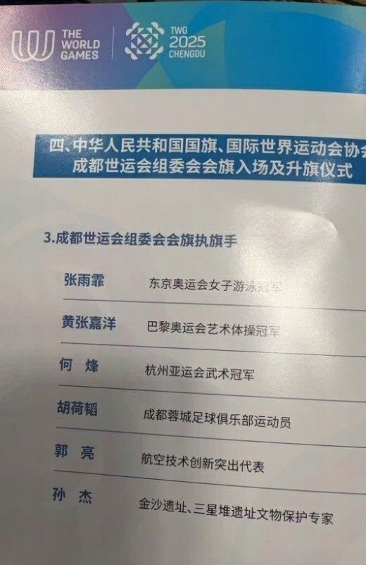 8月7日訊 成都世運(yùn)會(huì)今晚開幕。據(jù)據(jù)介紹手冊(cè),成都蓉城球員胡荷韜將與張雨霏、黃張嘉洋、何烽、郭亮、孫杰擔(dān)任組委會(huì)會(huì)旗執(zhí)旗手。