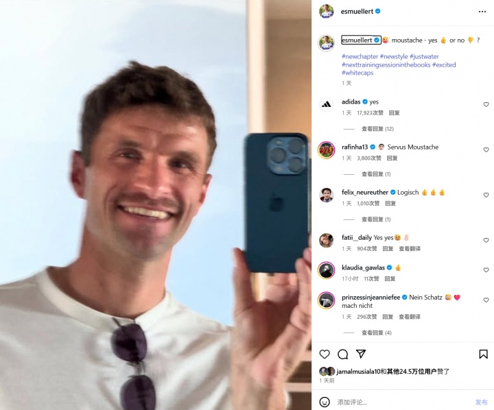 穆勒在社媒上發(fā)布了一張略顯模糊的自拍照,臉上新留了胡子,笑容滿面。他還直接問(wèn)粉絲們要不要留胡子。