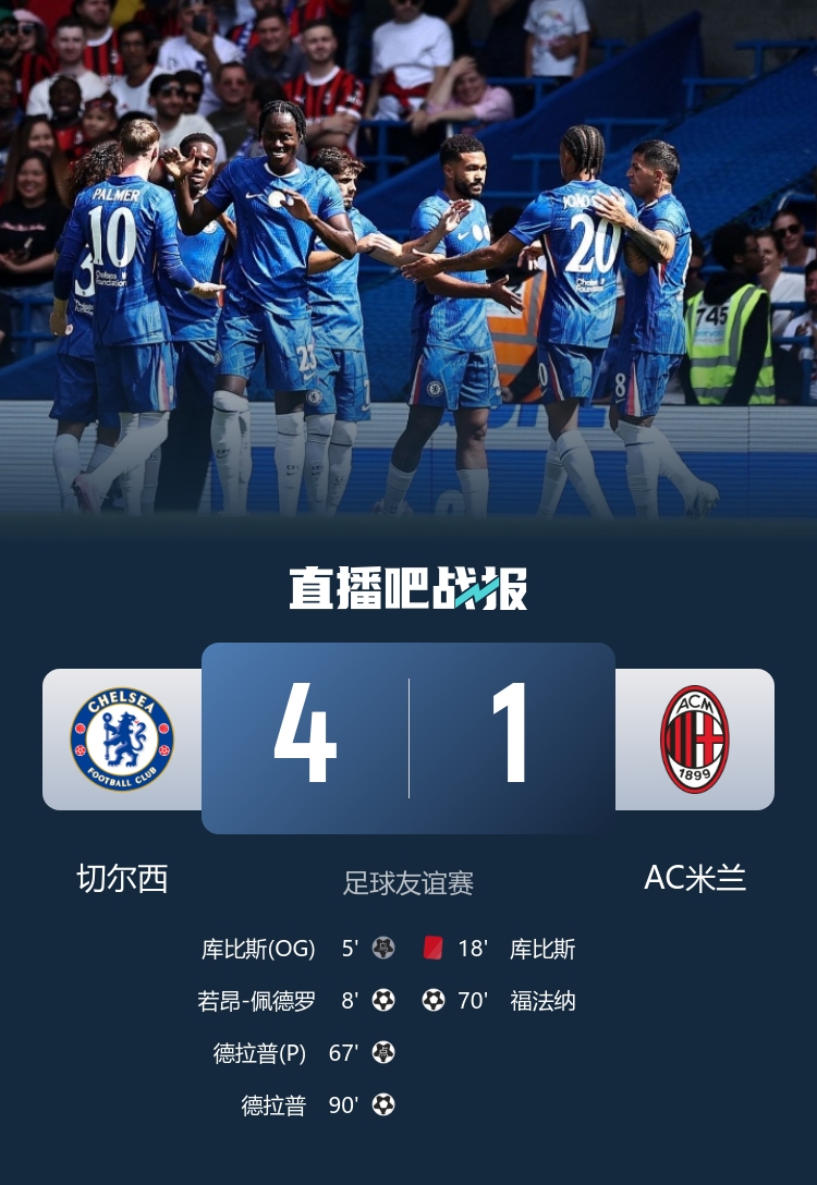 8月10日訊 北京時間8月10日晚上22:00,足球友誼賽,切爾西坐鎮(zhèn)斯坦福橋球場對陣AC米蘭。上半場,庫比斯烏龍,佩德羅頭槌建功,庫比斯作為最后一名防守人拉倒若昂-佩德羅染紅。下半場,德拉普點射,福法納扳回一球,德拉普壓哨破門。全場結束,切爾西4-1AC米蘭。