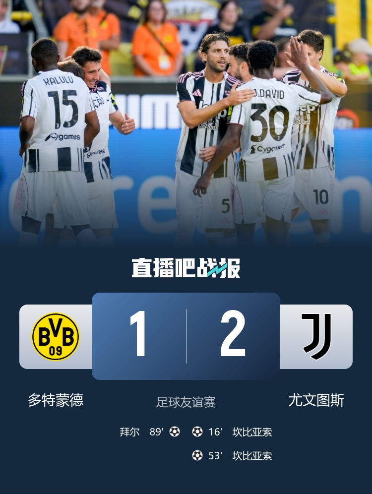 8月11日訊 北京時間8月10日23點30分,足球友誼賽,多特蒙德對陣尤文圖斯,這場比賽也是胡梅爾斯的謝幕戰(zhàn)。上半場,坎比亞索破門,胡梅爾斯第20分鐘被換下,聚勒替補登場傷退。下半場,坎比亞索梅開二度,拜爾扳回一球。最終尤文圖斯2-1擊敗多特蒙德。