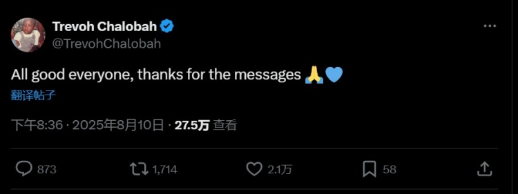查洛巴寫道:“一切安好,感謝大家的留言 ????”