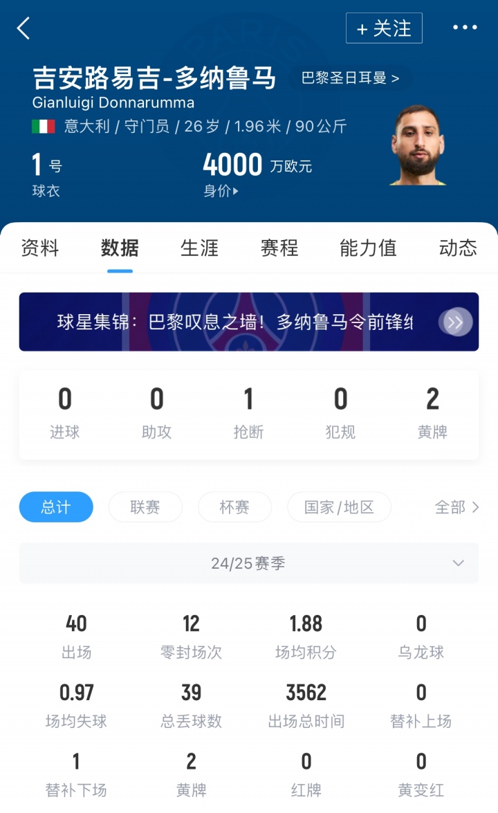 多納魯馬2021年自米蘭轉(zhuǎn)會巴黎,上賽季為巴黎出場40次,取得12場零封,場均失球0.97個,目前其德轉(zhuǎn)身價為4000萬歐。