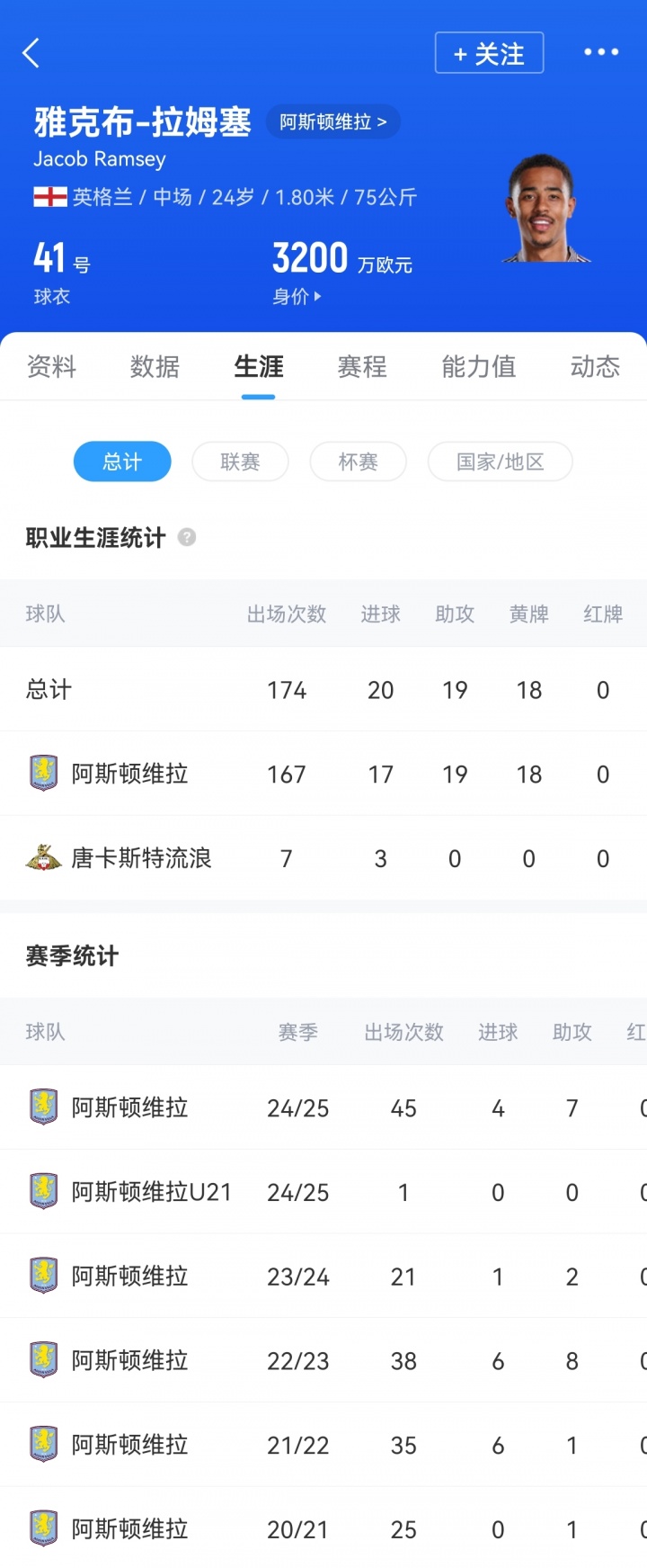 拉姆塞是維拉青訓(xùn)出身的球員,6歲就加入維拉青訓(xùn)學(xué)院,2019年與維拉簽署職業(yè)合同。截至目前,拉姆塞為維拉出戰(zhàn)137次打入14球,他的德轉(zhuǎn)身價(jià)是3200萬(wàn)歐元。