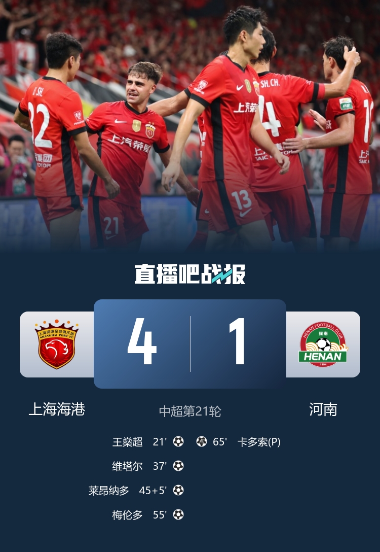 全場(chǎng)比賽結(jié)束,上海海港主場(chǎng)4-1戰(zhàn)勝河南。