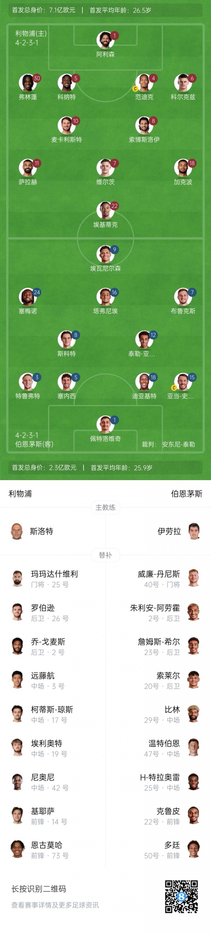 利物浦替補:25-瑪瑪達什維利、2-戈麥斯、3-遠藤航、14-基耶薩、17-瓊斯、19-埃利奧特、26-羅伯遜、42-尼奧尼、73-恩古莫哈