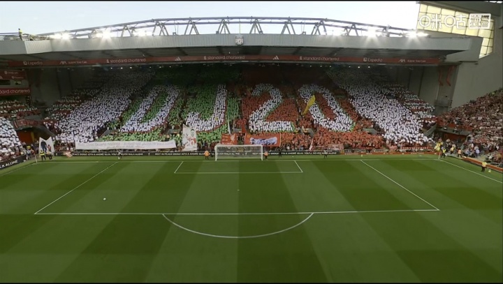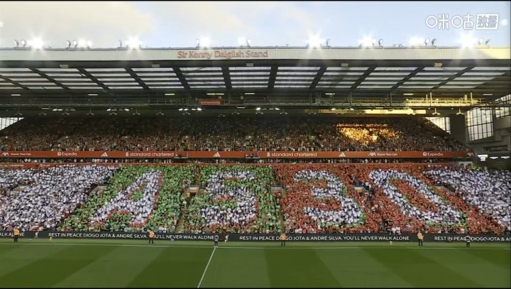 08月16日訊 利物浦vs伯恩茅斯,英超揭幕戰(zhàn),本場(chǎng)賽前,安菲爾德全場(chǎng)高唱you'll never walk alone,悼念過(guò)世的若塔。