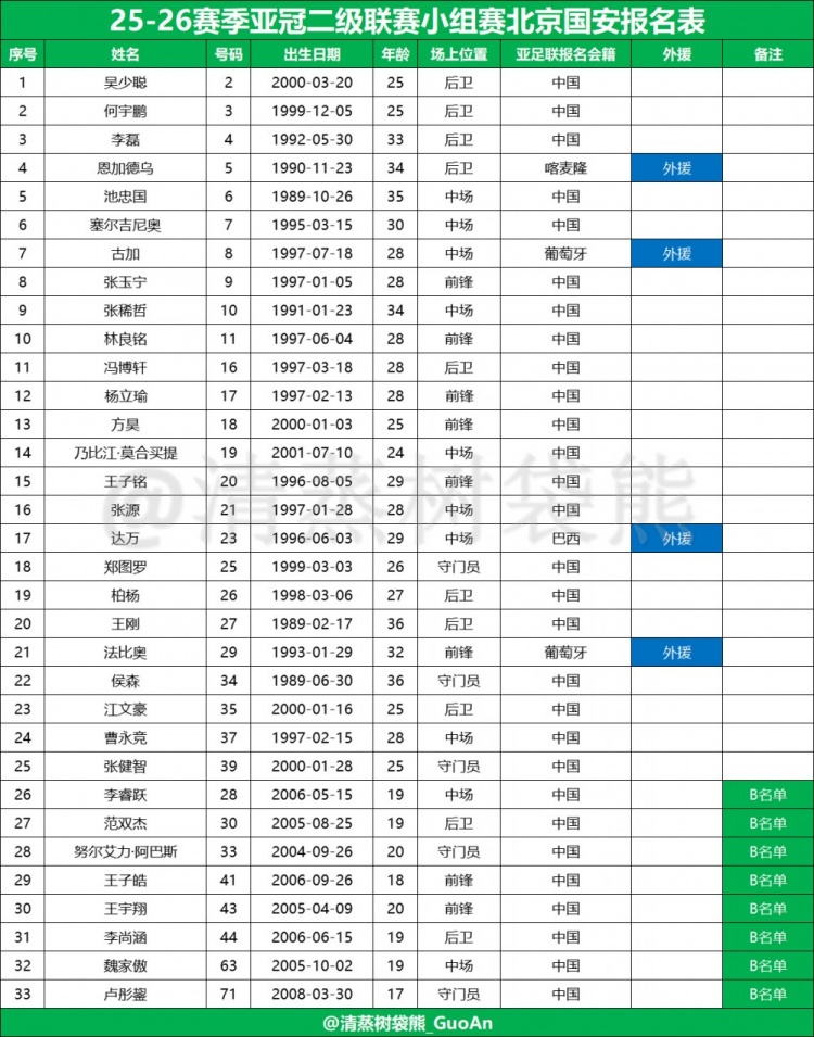 8月19日訊 今日,博主“清蒸樹袋熊_GuoAn”在社媒曬出了國安參加亞冠二級(jí)聯(lián)賽的球員報(bào)名表,其中恩加德烏、法比奧、古加和達(dá)萬四名外援在列,斯帕吉奇無緣;國內(nèi)球員方面,塞爾吉尼奧、張玉寧、張稀哲、林良銘等領(lǐng)銜。
