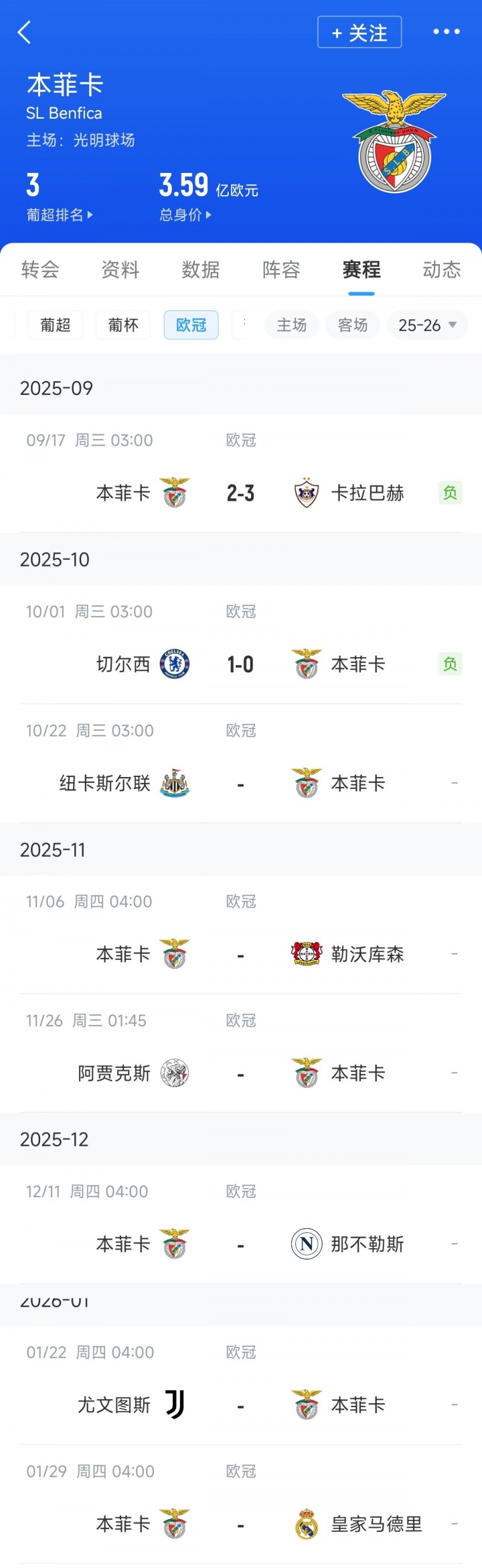 本菲卡本賽季的歐冠對手整體實(shí)力非常高,而他們首場比賽2-3爆冷不敵弱旅卡拉巴赫,前主帥拉熱也因此下課。穆帥接手之后,本菲卡客場不敵切爾西,他接下來還將帶隊(duì)對陣:紐卡、勒沃庫森、阿賈克斯、那不勒斯、尤文圖斯、皇馬,均是各國豪門勁旅。