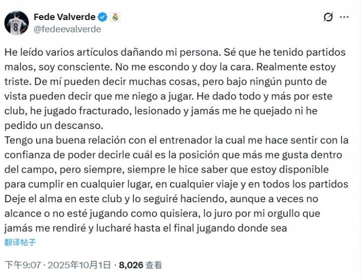 10月01日訊 巴爾韋德發(fā)布社媒,回應此前媒體報道稱自己拒絕出戰(zhàn)的說法,他表示自己與教練關系很好,愿為皇馬付出一切。