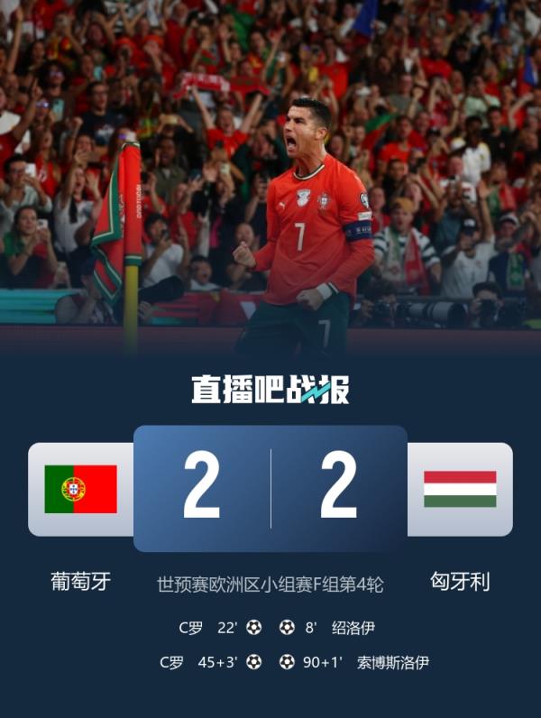 世預(yù)賽歐洲區(qū)小組賽F組第4輪,葡萄牙2-2匈牙利,無(wú)緣本輪晉級(jí)世界杯正賽,C羅梅開(kāi)二度。